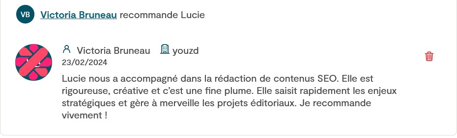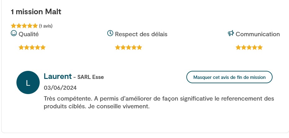 Lorsque nous avons terminé la prestation que vous m’aviez confiée, nous faisons ensemble le bilan, et prévoyons un suivi en cas de de baisse de position de vos pages. C’est aussi à ce moment-là que j’en profite pour vous demander, à mon tour un service ! Une recommandation sur LinkedIn ou un avis sur mon travail ! Il s’agit d’un petit geste grandement apprécié 😉