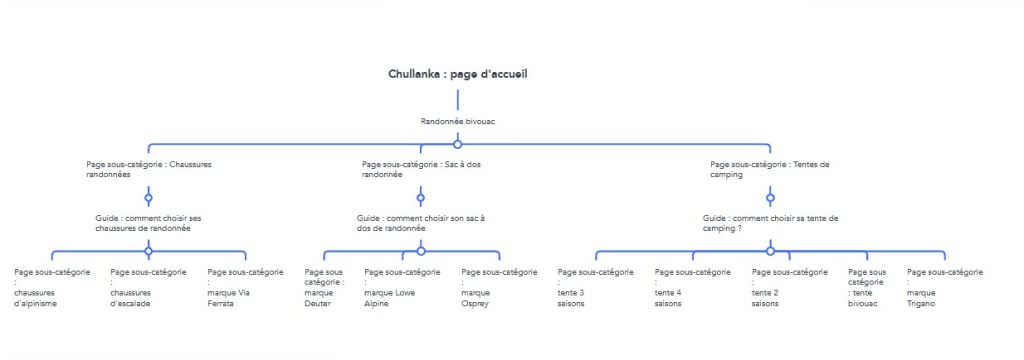 Cette technique de SEO a été inventée et développée par Laurent Bourrelly, référenceur français depuis 2004. Il s’agit d’une stratégie de maillage interne entre des pages de même sujet. Le but est de diriger le trafic d’un site vers certaines pages générant un forte conversion. On dit que l’on donne du « jus » SEO à ces pages. Je suis une adepte des analogies, et je trouve qu’une bonne façon de expliquer simplement le cocon sémantique est de le voir comme un arbre. Les racines elles-même ont à leur base, de minuscules racines. À leur sommet, on trouve le tronc. C’est exactement le même fonctionnement pour le cocon : à la base, on trouve des pages petites-filles, liées à des pages filles, liées elles-mêmes à des pages mères (aussi appelées pages piliers). C’est le tronc de l’arbre ! Pour un site e-commerce, les pages mères vont être les pages catégories de produit. Pour continuer avec l’exemple de Chullanka, voici une mindmap, carte mentale représentant l’architecture d’une partie du site, dédiée à la randonnée et au bivouac (vous verrez un peu plus loin la représentation de l’architecture complète du site) :